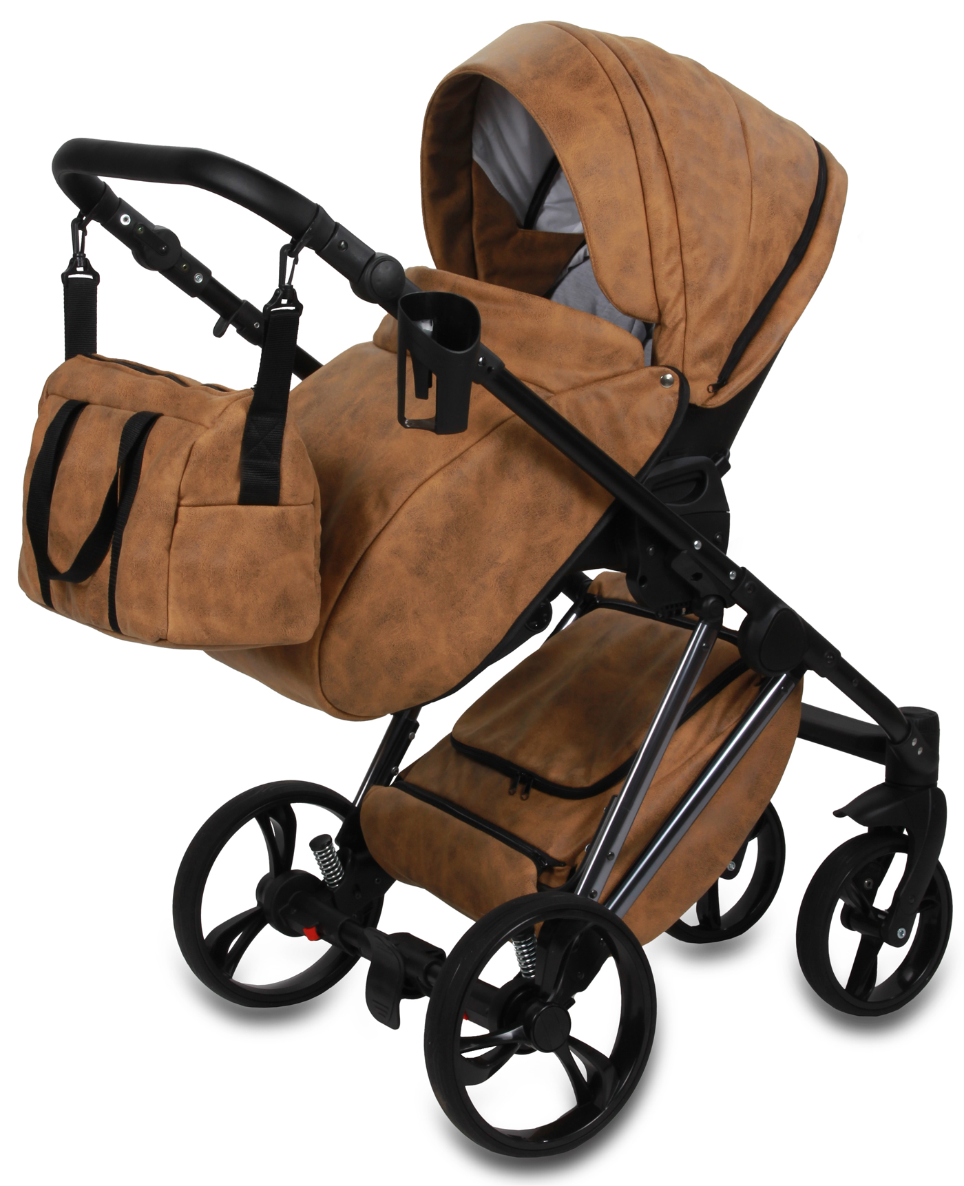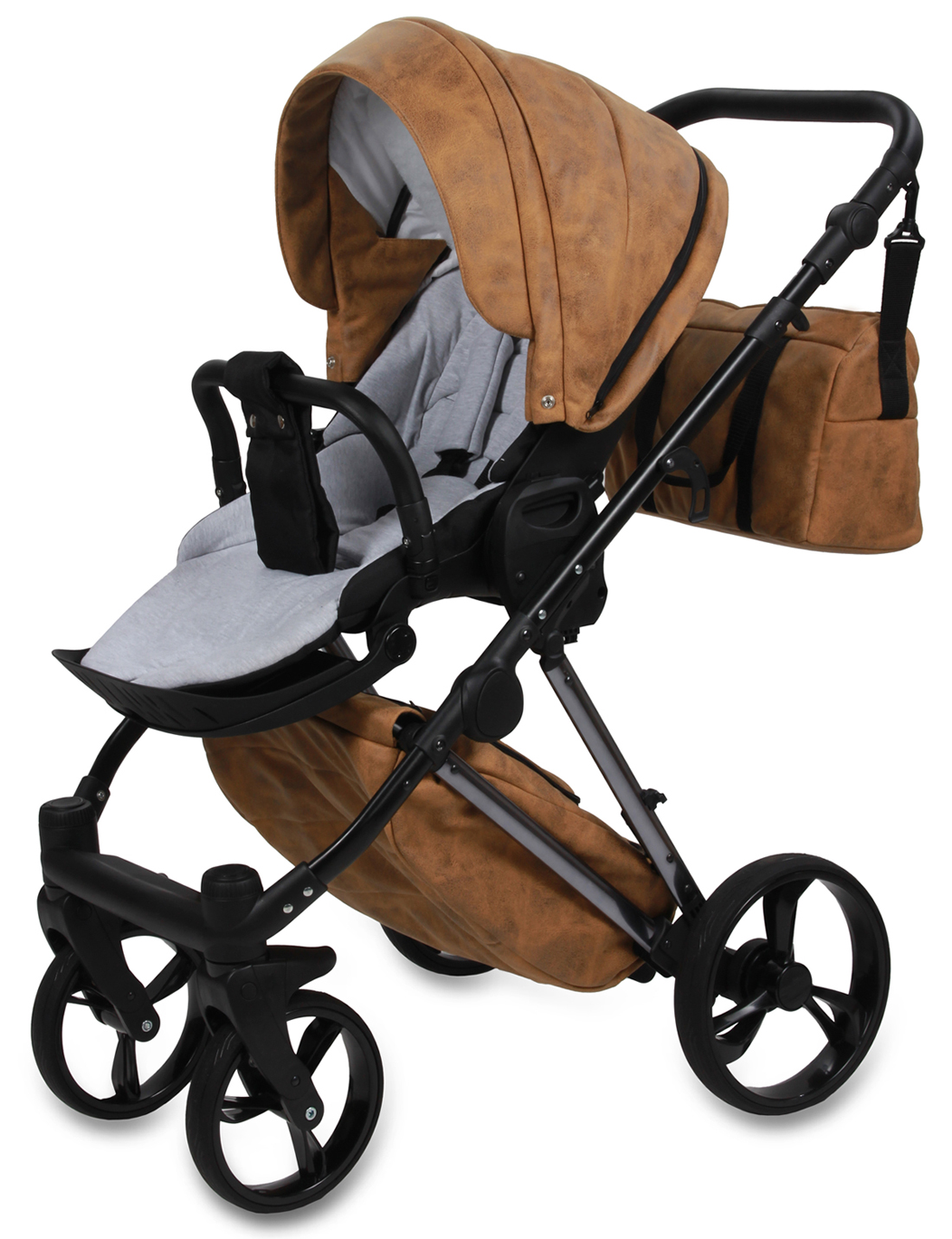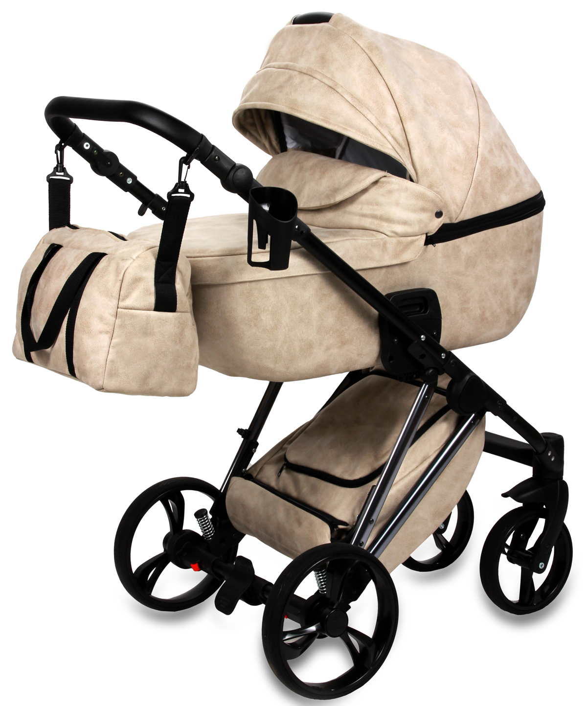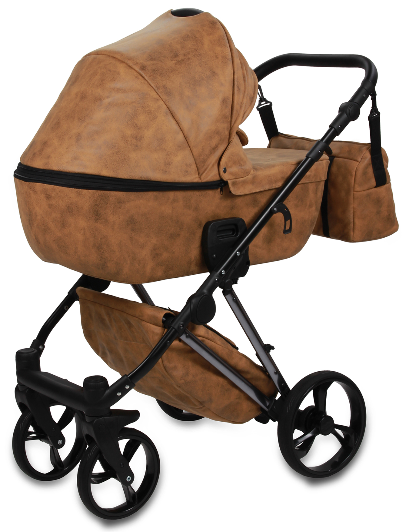 Możliwość przenoszenia gondoli za rączkę w budce, rączka z eko-skóry.