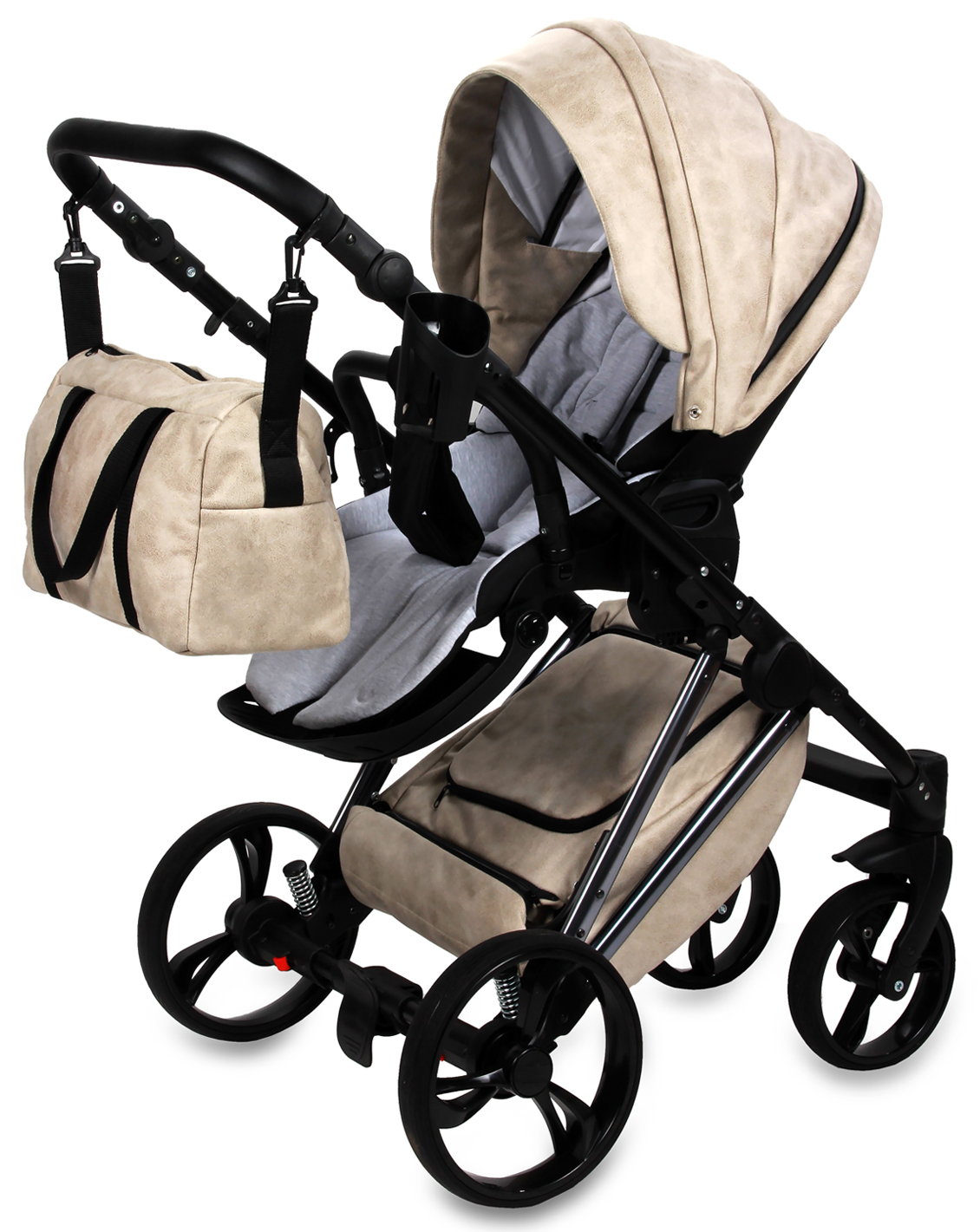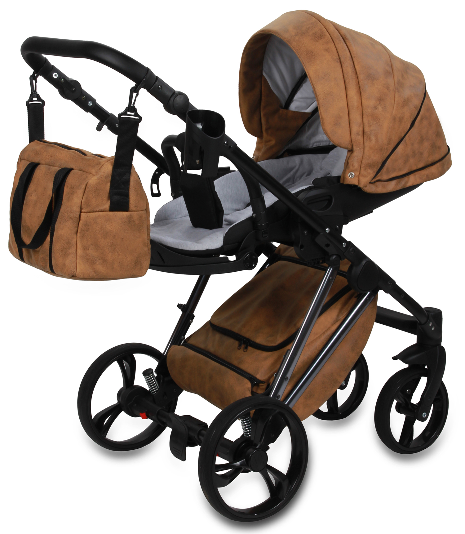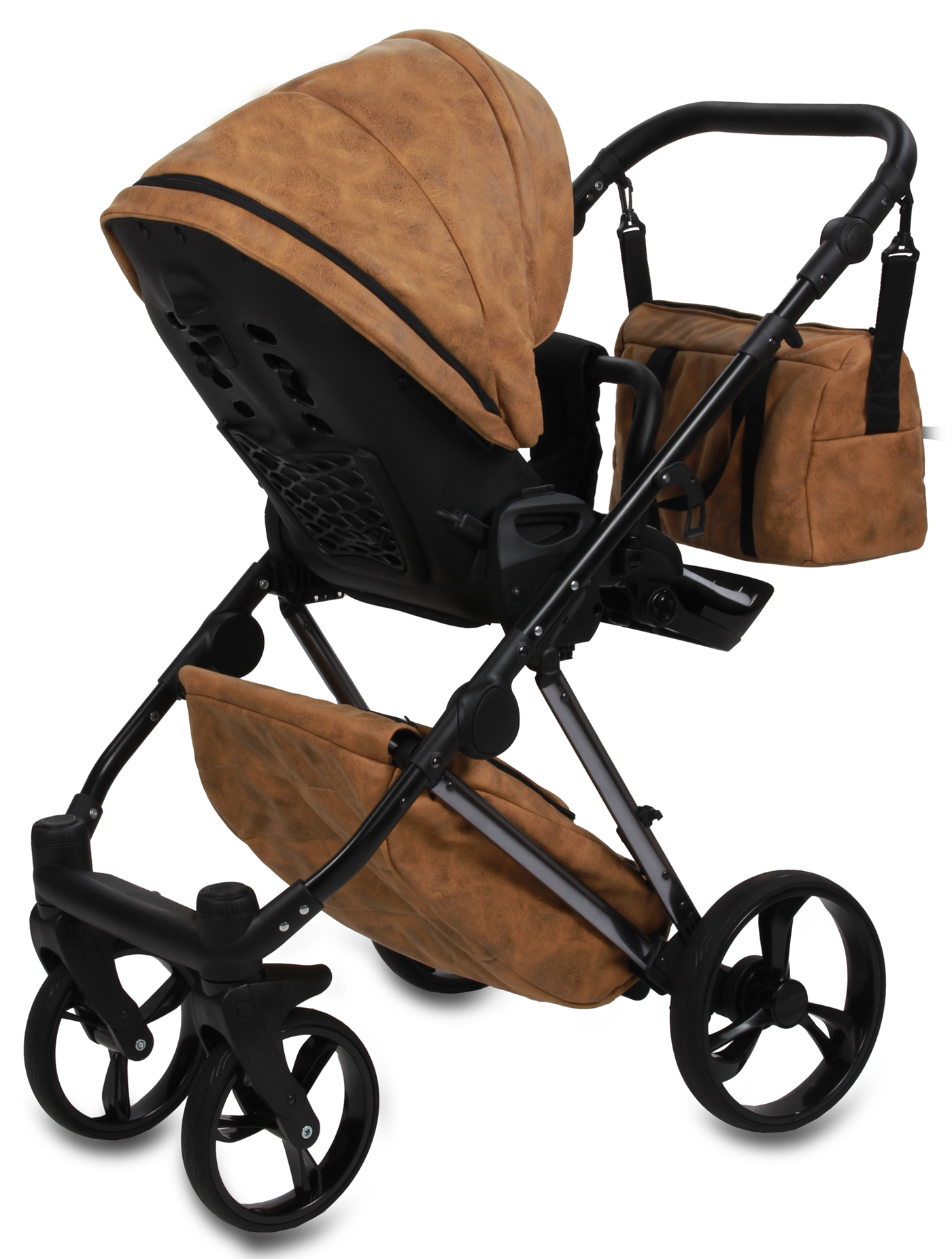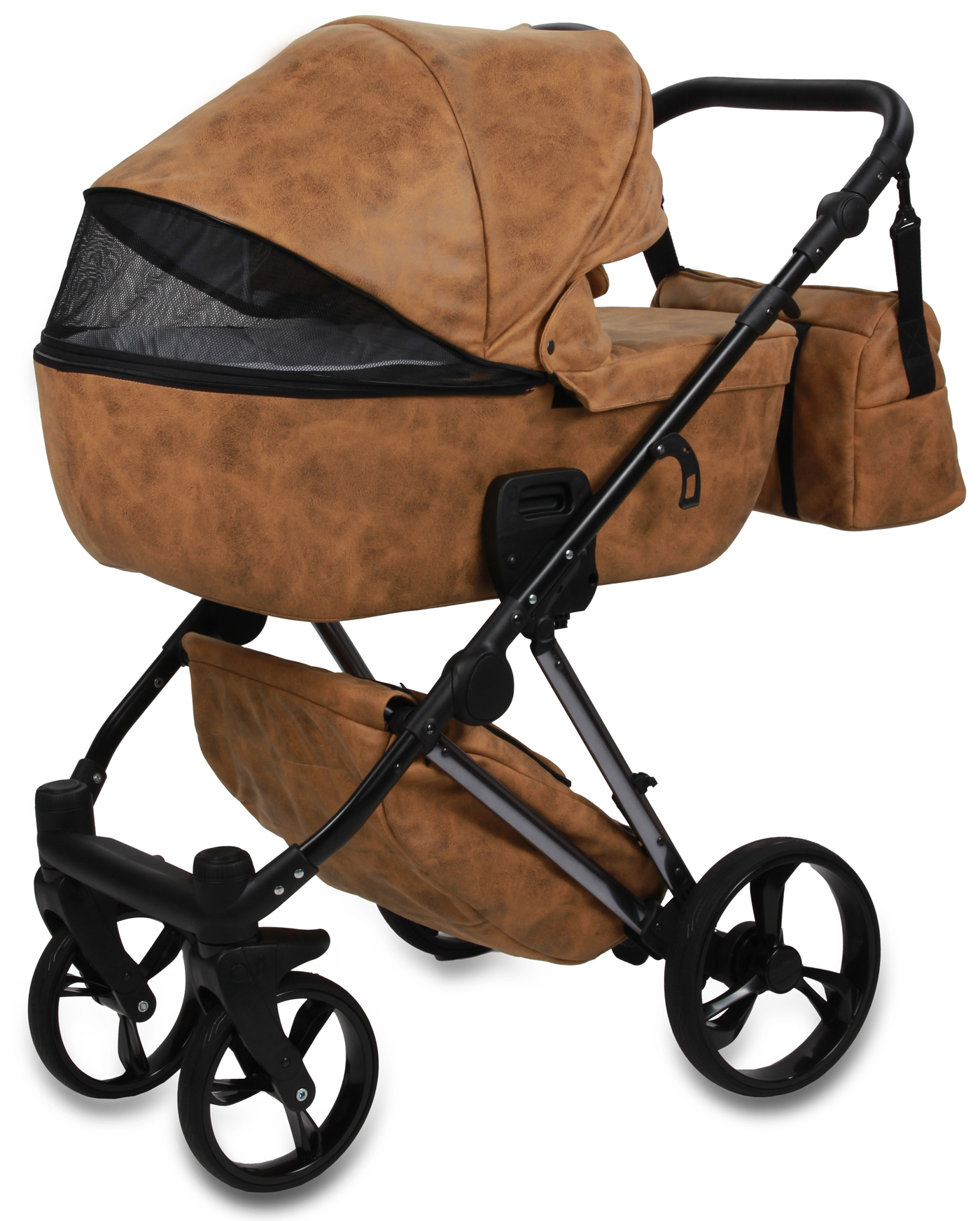Możliwość przenoszenia gondoli za rączkę w budce, rączka z eko-skóry.
