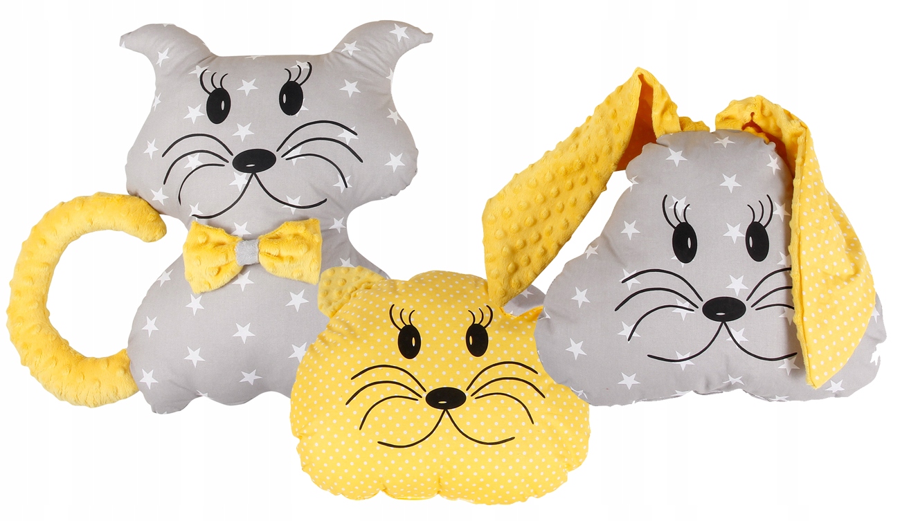 W zestawie 3 poduszeczki o ciekawych kształtach uroczych zwierzaczków. Poduszki-przytulanki wykonane są z tkaniny bawełnianej łączonej z minky. Wypełnienie stanowi mięciutka antyalergiczna kulka sylikonowa. Kolorystycznie pasują do całości zestawu.